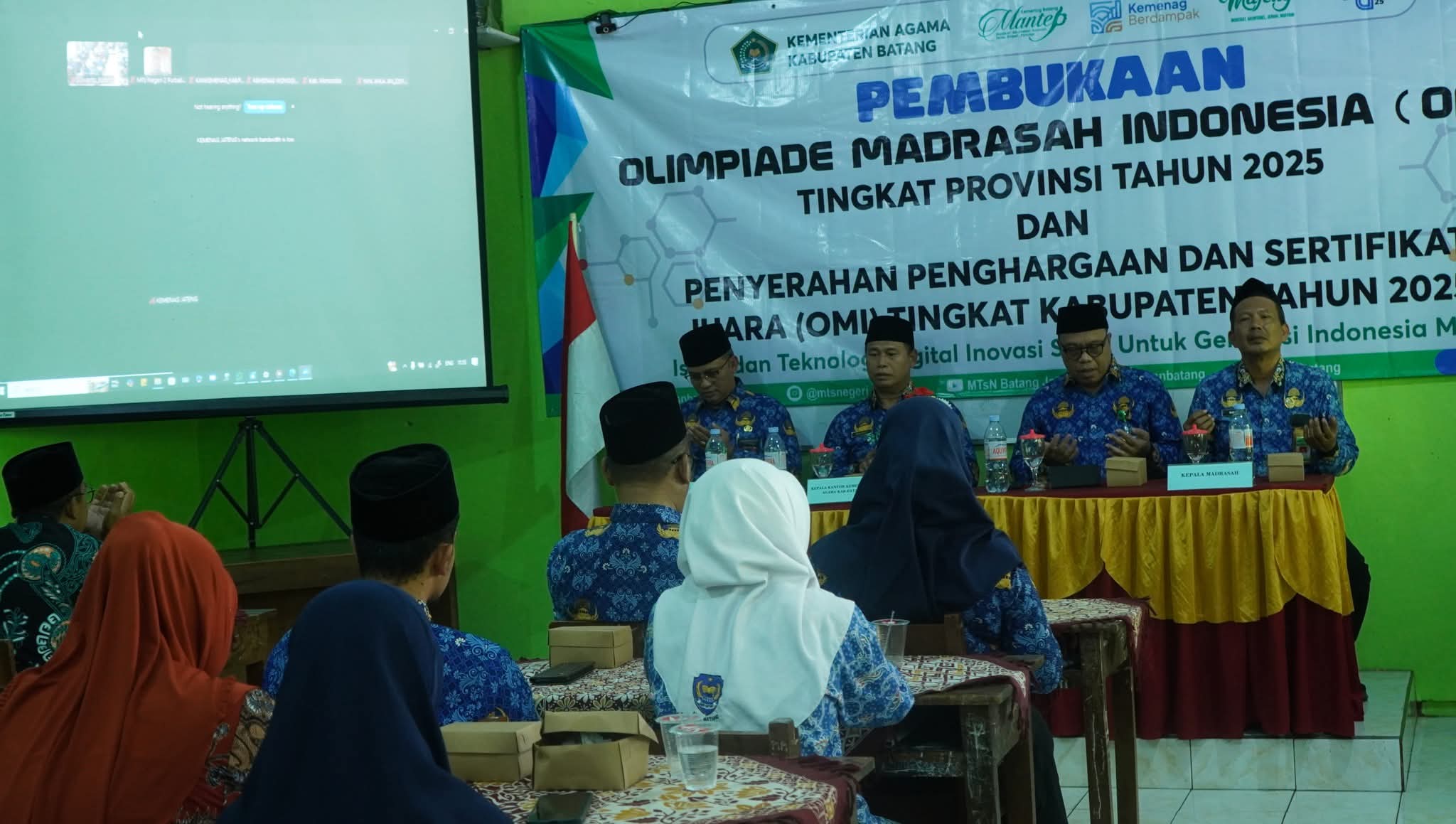 Batang (Humas) – Kantor Kementerian Agama Kabupaten Batang mengikuti acara Pembukaan Olimpiade Madrasah Indonesia (OMI) Tingkat Provinsi Jawa Tengah Tahun 2025 secara daring. Usai kegiatan tersebut, dilanjutkan dengan penyerahan penghargaan dan sertifikat bagi juara OMI tingkat Kabupaten Batang yang digelar pada Rabu (1/10/2025) di Aula MTsN Batang.