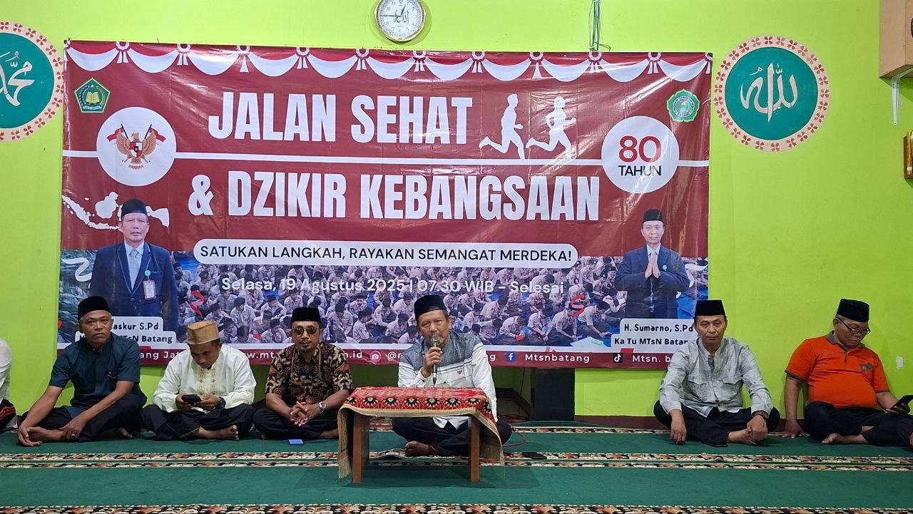 Batang (Humas) – Untuk memperingati Hari Ulang Tahun (HUT) ke-80 Republik Indonesia, MTs Negeri Batang menggelar rangkaian kegiatan Jalan Sehat dan Dzikir Kebangsaan Selasa (19/8/2025) di lingkungan madrasah. Seluruh siswa, guru, serta tenaga kependidikan (tendik) turut berpartisipasi dengan penuh semangat kebersamaan.